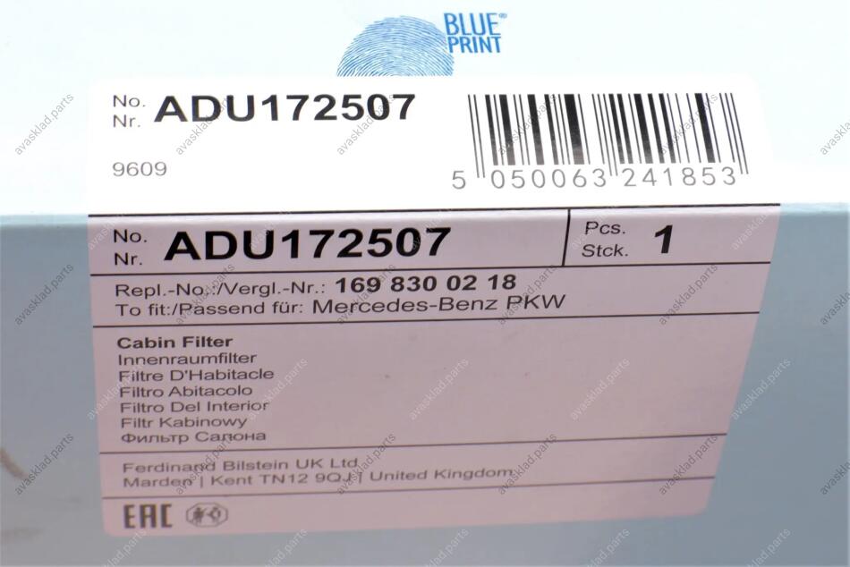 Змінний фільтруючий елемент повітряного фільтра салону BLUE PRINT ADU172507