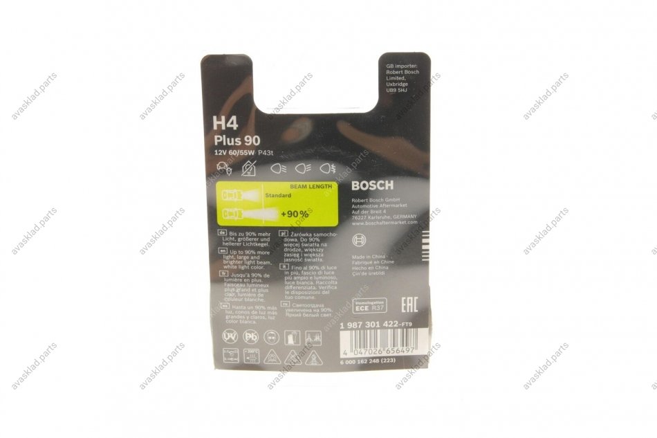 Автолампа H4 PLUS 90 12V 60/55 W P43t BOSCH 1987301422